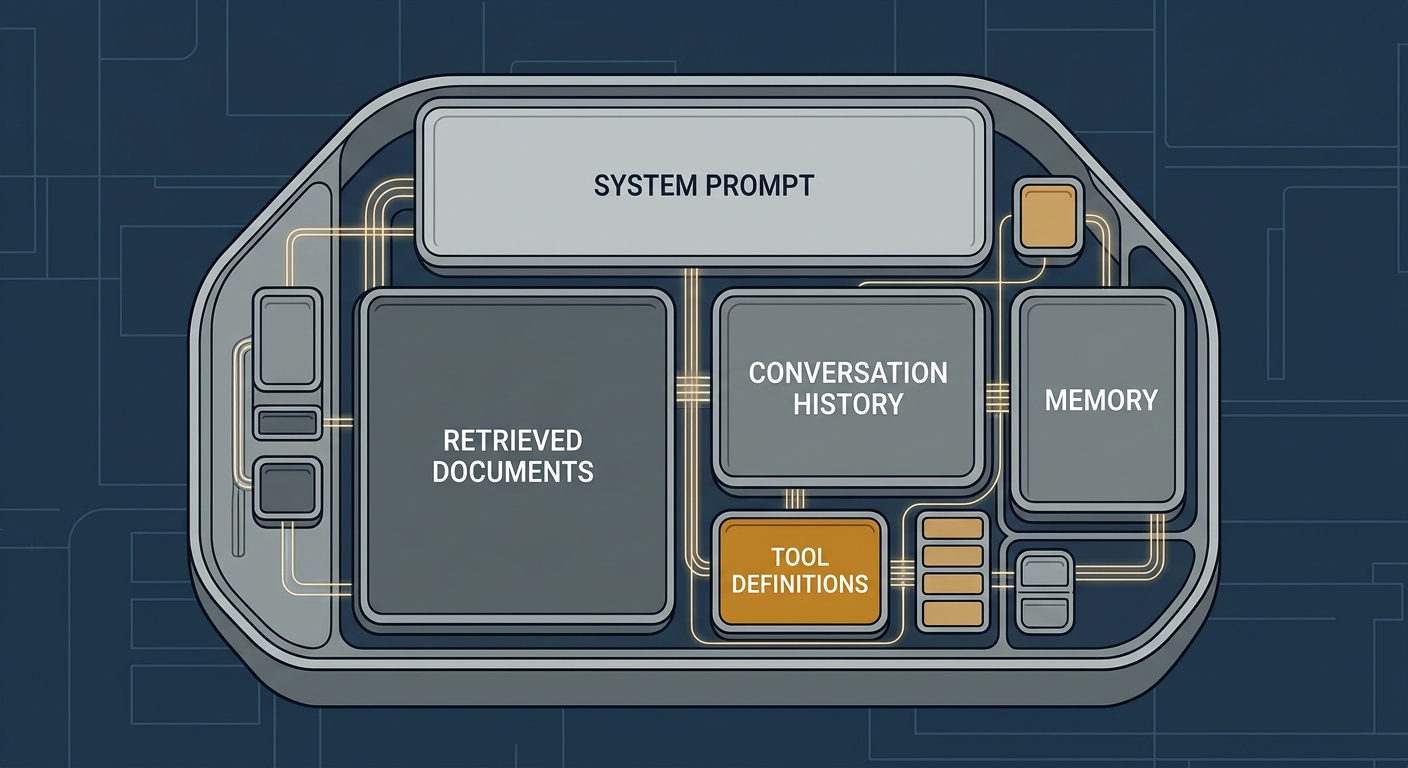 - Tool definitions - every tool the model could call must be described in the context (name, description, parameters schema). With MCP toolsets, this can easily balloon into hundreds of tool descriptions.